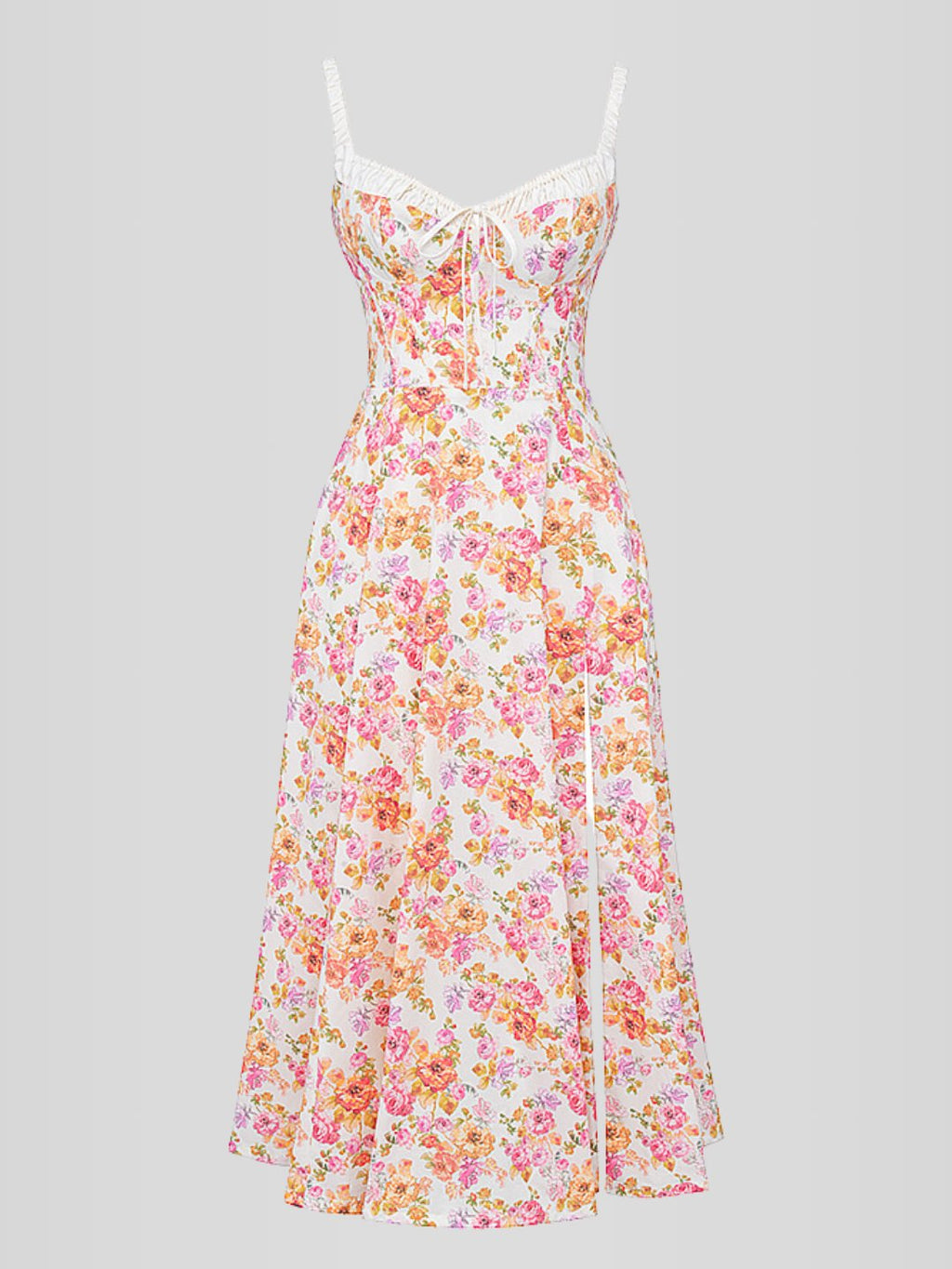 - Descubra o charme do Vestido Bustier Fátima- Um design midi encantador com estampa floral delicada sobre tecido de 95% poliéster e 5% elastano.